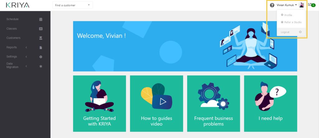 1. After Logging in, you will see the KRIYA Dashboard Welcome Page for your Account.