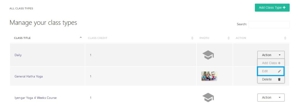 Select The actions button for the Class type you want to delete and Click on Edit.