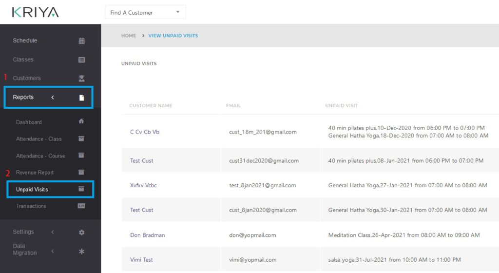 The KRIYA Booking System has a feature that lists unpaid visits by business customers. This is a Resultant Report of Pay Later feature, which helps when a Customer wants to attend some Sessions / Visit on the spot; with our system, Businesses can Add the Customer and let them pay later.